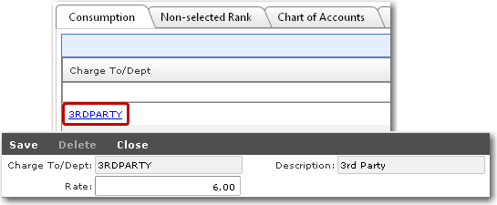 To set up consumption rates for each department: 1. From the HR Manager main menu, click Payroll Setup under the Home - Administration sub menu. The Payroll Setup screen is displayed. Then, click the Consumption tab. 2. Use the Fleet search field to search and select a vessel for which you want to set up provision consumption rates. The Departments that have been set up for this vessel along with its descriptions will then be displayed. Note: To use a previously saved list of vessels, click the search icon in the Fleet search field to use the Vessel List feature on the HR Manager simple search window. Use the drop-down function to select and load a list from the Vessel List section. Then click a vessel from this list to load the record. 3. Enter the per-day consumption rate (monetary value) for each department. Click on a record and set the consumption rate in the Rate field for each department. 4. Click Save to save your entries.