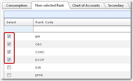 If the vessel account you are setting up is only to perform payroll for specific ranks, you may exclude the unrelated ranks in this tab. The excluded ranks will then not be displayed in the Payroll Summary.