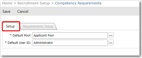 To set up default pool and user ID for new application submissions: 1. From the HR Manager main menu, click Competency Requirements under the Home - Recruitment Setup sub menu. 2. On the Competency Requirements screen, click the Setup tab and define the following: