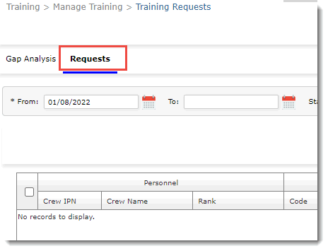 Screen Navigation: Training - Manage Training - Training Requests - Requests tab