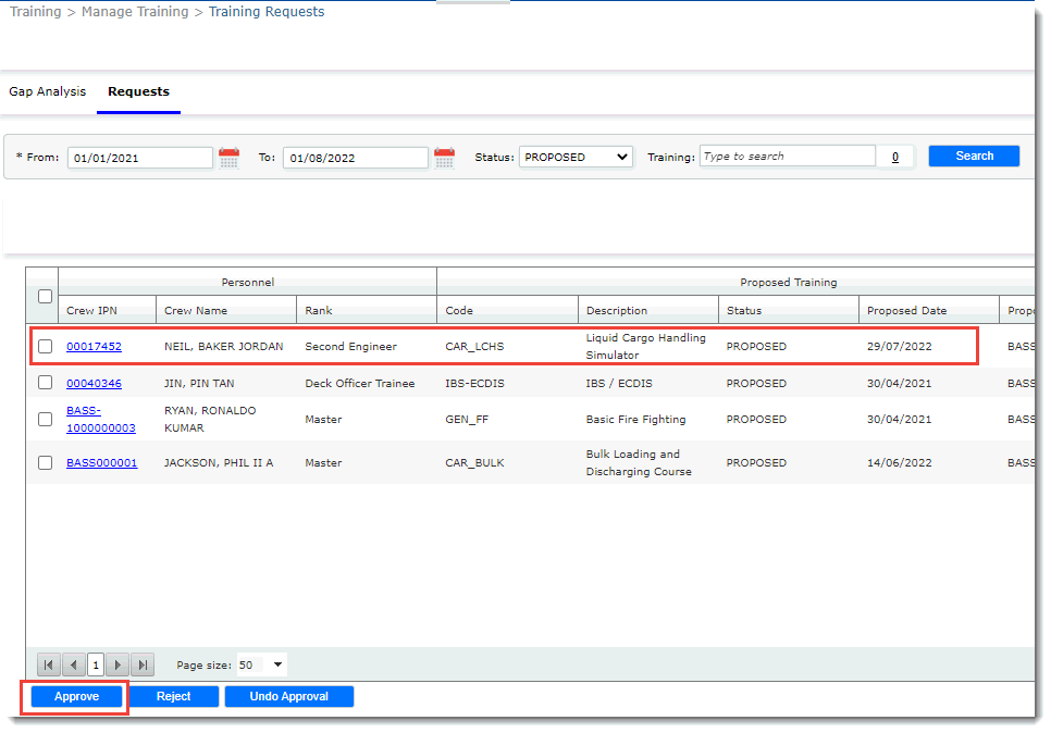 To approve a training that has been proposed for a particular crew member: 1. From the HR Manager main menu, click Training Requests under the Training module. 2. The Training Requests screen will be displayed. Click the Requests tab and carry out a search for trainings that have been proposed based on a date range. 3. To specify a date range for the search, select the From and To dates from the calendar Lookup functions. 4. Next, select 'Proposed' from the Status drop down menu. Note that you may also search by the training activity, and select all crew members to display all crew who have a training request for that particular activity. 5. Click Search. 6. A list of personnel and their proposed trainings will be displayed. The Personnel column in the table displays the basic information of the personnel who have been proposed to attend the training. The Proposed Training column displays the following: