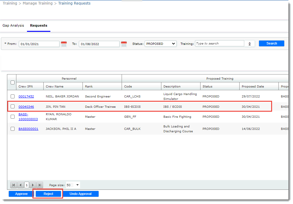 To reject a training that has been proposed for a particular crew member: 1. From the HR Manager main menu, click Training Requests under the Training module. 2. The Training Requests screen will be displayed. Click the Requests tab and carry out a search for trainings that have been proposed based on a date range. 3. To specify a date range for the search, select the From and To date from the calendar Lookup functions. 4. Next, select 'Proposed' from the Status drop down menu. 5. Click Search. 6. A list of personnel and their proposed trainings will be displayed. The Personnel column in the table displays the basic information of the personnel who have been proposed to attend the training. The Proposed Training column displays the following: