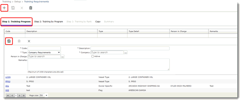 This feature enables you to define the training courses that are required for a crew member. Step 1 allows you to define the details of the training such as the Code, Type (Vessel, Company Requirements, Flag, and Owner Specific), Person in Charge, Description, and Company. You can also choose to activate the training by selecting the Active check box.