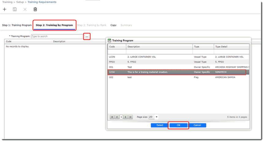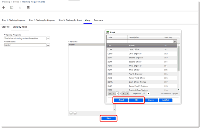 To define the training requirements: 1. From the HR Manager main menu, click Training Requirements under the Training module. 2. The Training Requirements screen will be displayed. Click the Step 1: Training Program tab. To begin creating a training course, click the + button. 3. Define the training details of the course you are creating by updating the applicable please. Ensure that mandatory fields (marked with *) are populated. 4. Check the Active check box to activate the training and allow them to be visible to the relevant crew members. 5. Once the fields are populated, click Save. 6. The newly created training program is now saved. To edit the detail of the training program, you can click the Code and proceed update and Save the record. 7. Click Step 2: Training by Program to proceed to the next step. 8. Click the locate (…) button to search for the training program created in Step 1. 9. Select the training program created in Step 1. 10. Click OK to proceed. 11. Select the category the training program belongs to. You can also set the Validity Period of the training program. Note: To select all training courses under a training group at one go, click the Check All link. Similarly, to deselect all training courses under a training group at one go, click the Uncheck All link. 12. Click Save. 13. Click the Step 3: Training by Rank tab to select the Ranks for which this training is required. Under the Step 3 tab, the system will only display training courses that have been selected under Step 2. 14. Click the lookup (…) button to search for the rank the created training course is applicable to. 15. Click the relevant rank, and click Select and OK. 16. Assign any additional training courses required for the particular rank. 17. Under Training Requirement Type, define the requirement type of the training. For example, the course could be Mandatory or it could be an Additional course for the rank. This will be used as indication when performing the Training Gap analysis. Note: Admin users can create more training requirement types, such as Optional, Recommended, and so on in the Training Requirement Type Register. The Validity Period column is used to specify the number of months a training course is valid for the selected rank. The Reference column provides the Standards of Training, Certification, and Watchkeeping for the training course, if any. 18. Under the Copy tab, select either the Copy All or Copy by Rank tab to copy the created training requirements to another vessel or rank type. 19. Depending on the tab selected, click the vessel or rank you want to copy the training program to, and click Select and OK. 20. Click the Save button once you have made your selection. A message will appear for your confirmation to proceed. Click Yes. 21. Move on to the Summary tab. Under this tab, you can view the entire training requirements setup that you have carried out in a matrix format. The training requirements that will be displayed in this matrix are for the Type that you have selected under the Step 1 tab. Note: Click Training and/or Rank to sort the training and/or rank by ascending or descending order.