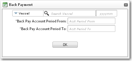 3. The Back Payment pop-up window will be displayed. Enter the Vessel and the account period that the back payment will be paid to. In the Back Pay Account Period From and Back Pay Account Period To fields, specify the range of closed account periods for which the back payment is owed. Note: If the back payment is owed for one specific account period, enter the same account period in both fields. 4. Click OK. Once this has been carried out, the back payment for all crew members who have changes in their CBA will be reflected in their Other Earnings. Note: In the Cost Element Register, you can use the Back Pay Against field to select the cost element that any back payment to the crew member is to be made against. For example, if you create a cost element called 'Back Pay Basic Salary' and then select the cost element called 'Basic Salary' in the Back Pay Against field, this indicates that the crew member is being given back payment against his basic salary.