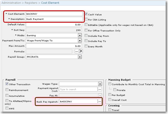 This feature allows you to recalculate the wages of all crew members who have salary changes in their CBA to include the back payment owed to him in the next account period. This feature is convenient in instances where a crew member is owed back payment from a previous account period (for example, if the crew member had a salary increment that is to be back paid for the previous two months. Note that this change in salary should be indicated in his CBA).