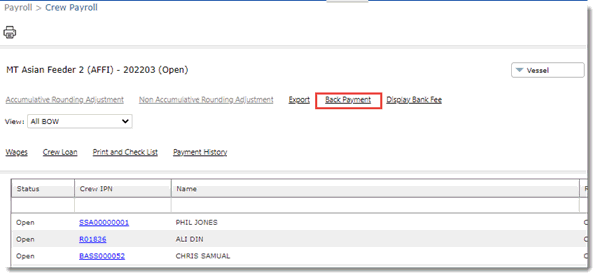 Screen Navigation: Payroll - Crew Payroll - Back Payment link