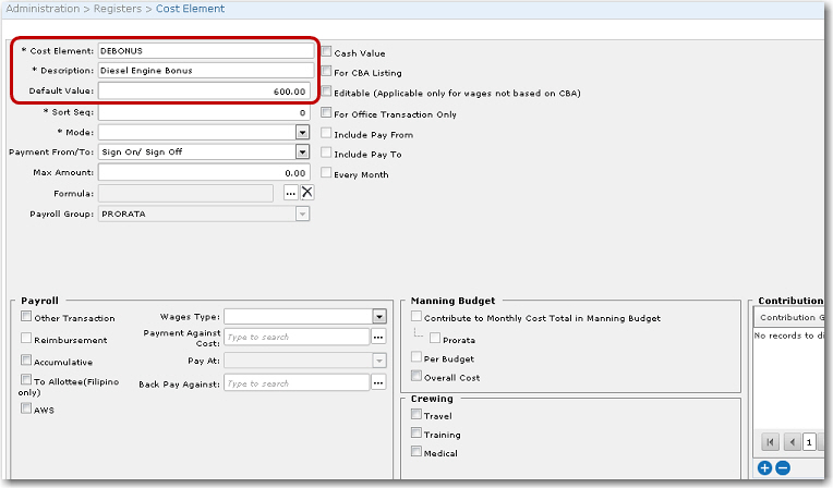You can include a Diesel Engine Bonus in the crew member’s wages. You will need to register a new cost element for this purpose (ensuring of course that the code used matches the System Configuration code setup). In the Global Settings Register, you would need to specify the exact Vessel for which this DE Bonus is given. You can then assign this cost element to a CBA and as well as to a crew member’s wage.