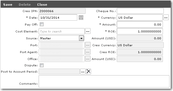 To enter cash deductions for a crew member: 1. From the HR Manager main menu, click Crew Payroll under the Payroll menu. 2. The Crew Payroll screen will be displayed. Use the search field to carry out a search for crew members based on either Vessel, Personnel List, Pool, Agent, Crew or All (i.e. all crew members based on the entered account period). Ensure that the correct account period has been entered and click Go. Note: Click the search icon in the search field to make your selection of Vessel, Personnel List, Pool, Agent, Crew or All (i.e. all crew members based on the entered account period) from a list in the relevant pop-up window. 3. The crew members based on your selection will then be displayed on the screen. Click on a crew member's Crew IPN record to view his payroll details. Then, in the Deductions column, click on the Cash link. This is where you enter details of cash advances taken by the crew member for the purposes of making deductions from his wage or to indicate that the crew member was paid off in cash upon sign off. 4. On the Cash window, click the '+' icon at the bottom of the table to add new cash deductions for the crew member. Enter information in the following fields: