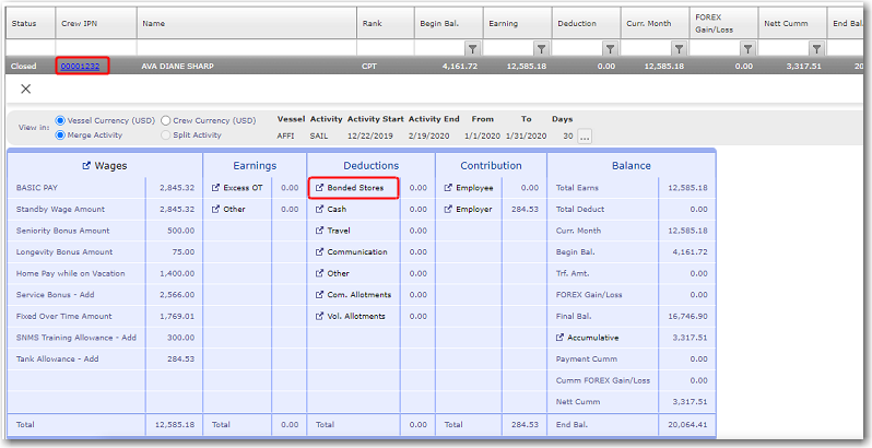 Entering Bonded Store Deductions for a Crew Member
