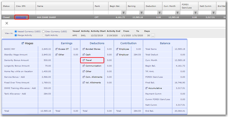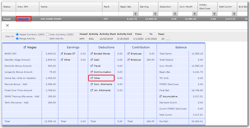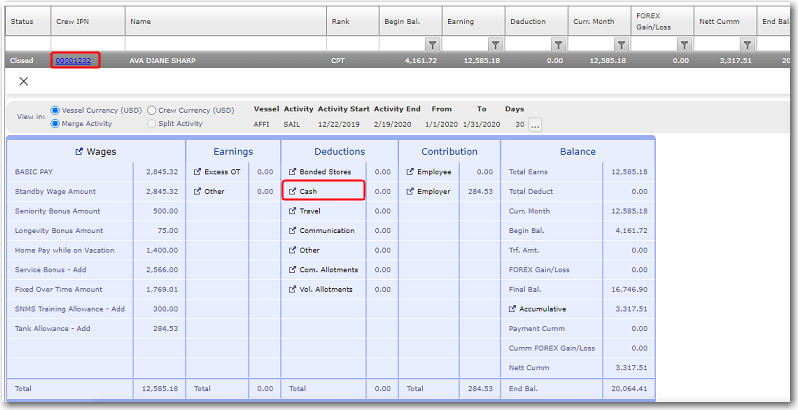 Here you can enter all crew-related deductions for an account period. These deductions are categorized as Bonded Stores, Cash, Travel, Communication and Other Deductions.