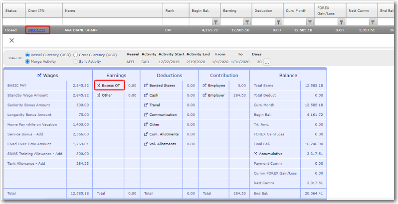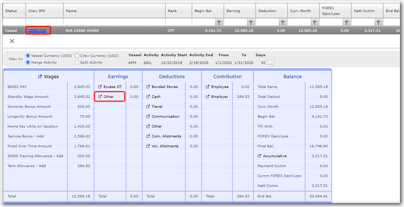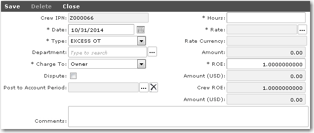 Here, you can enter all crew-related earnings for an account period. These earnings are categorized as Excess Overtime and Other Earnings.
