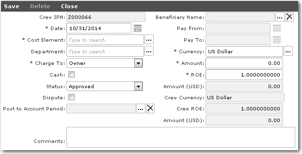 To enter other earnings for a crew member: 1. From the HR Manager main menu, click Crew Payroll under the Payroll menu. 2. The Crew Payroll screen will be displayed. Use the search field to carry out a search for crew members based on either Vessel, Personnel List, Pool, Agent, Crew or All (i.e. all crew members based on the entered account period). Ensure that the correct account period has been entered and click Go. 3. The crew members based on your selection will then be displayed on the screen. Click on a crew member's Crew IPN record to view his payroll details. Then, in the Earnings column, click on the Other link. 4. On the Other Earnings window, click the '+' icon at the bottom of the table to add all earnings which are outside the crew member's regular income or expenses incurred. Enter information in the following fields:
