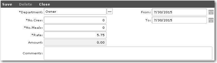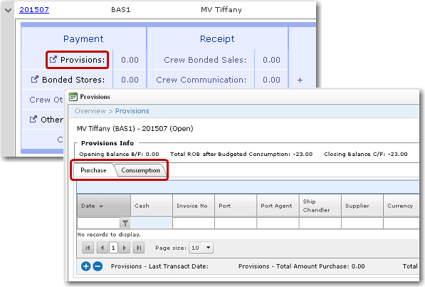 5. Click Save. The information you have entered will now be reflected in the table under the Purchase tab, as well as in the Payment column for Provisions on the Manage Ships Account screen. Note: To remove a record from the table, highlight a record and then click the '-' icon. 6. To add consumption details, click the Consumption tab. Click the '+' icon at the bottom left of the table. Data entry will be enabled where you can enter information in the following fields: