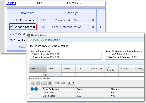 5. Click Save. The information you have entered will now be reflected in the table on the Bonded Stores window, as well as in the Payment column for Bonded Stores on the Manage Ships Account screen. Note: To remove a record from the table on the Bonded Stores window, highlight a record and then click the '-' icon.