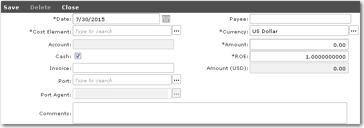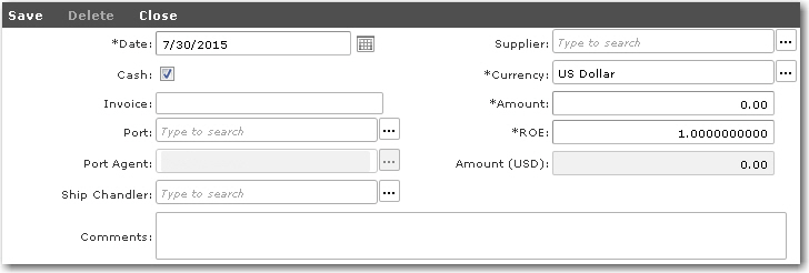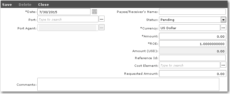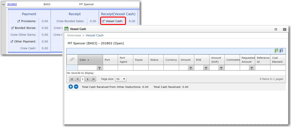 5. Click Save. The information you have entered will now be reflected in the table on the Vessel Cash window, as well as in the Receipt (Vessel Cash) column for Vessel Cash on the Manage Ships Account screen. Note: To remove a record from the table on the Vessel Cash window, highlight a record and then click the '-' icon.