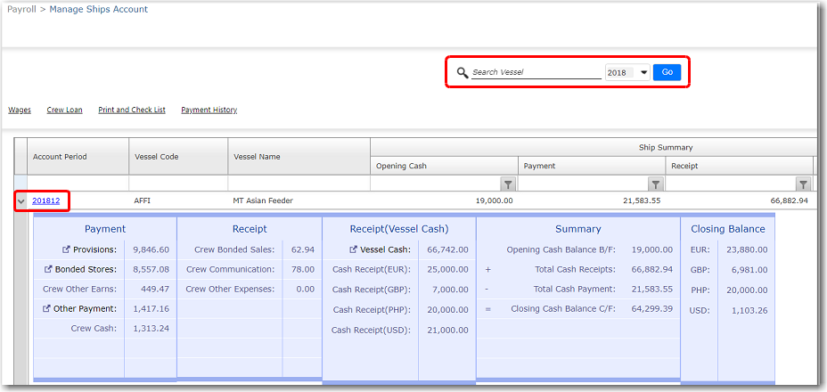Screen Navigation: Payroll - Manage Ships Account - Vessel link