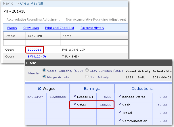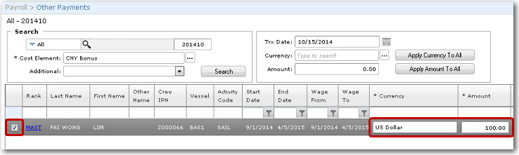 For crew members who did not receive a bonus (or any other specific payments) during the last SAIL activity, this feature can be used to search and list crew members and add these payments to their Other Earnings.