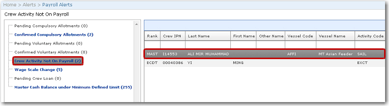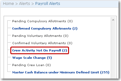 Screen Navigation: Home - Alerts - Payroll Alerts - Crew Activity Not On Payroll link