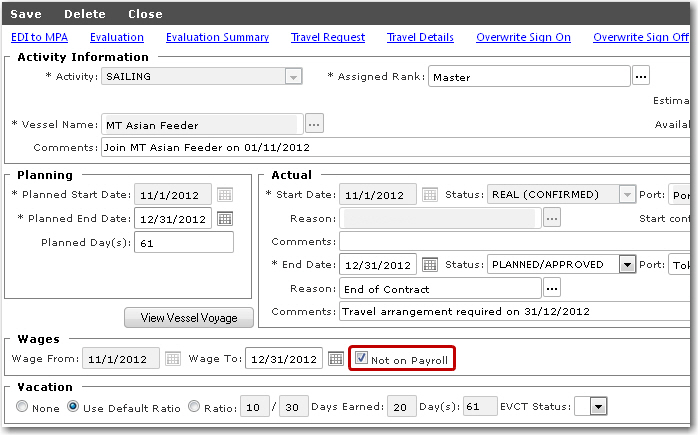 To work with the alerts: 1. From the HR Manager main menu, click Payroll Alerts under the Home - Alerts sub menu. 2. The Payroll Alerts screen is displayed. Then, click the Crew Activity Not On Payroll link. 3. A list of crew members who have been selected to not appear on the Payroll will be displayed i.e. crew members who have the 'Not on Payroll' check box selected on their Activity screen. Double-click on the crew member that you want to view. 4. The Activity screen of the selected crew member will be displayed. Click on an Activity Code of a particular activity for which the crew member will not be displayed in the Payroll records. If you decide that this is in error, then please clear the 'Not on Payroll' check box. Ensure that this check box is not selected and then click OK, followed by Save on the Activity screen. 5. Once done, this activity will no longer appear under the Crew Activity Not On Payroll alert.