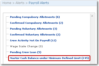 Screen Navigation: Home - Alerts - Payroll Alerts - Master Cash Balance under Minimum Defined Limit link