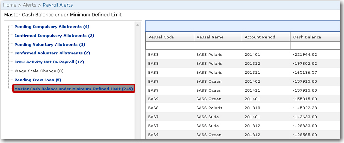 To view the alerts: 1. From the HR Manager main menu, click Payroll Alerts under the Home - Alerts sub menu. 2. The Payroll Alerts screen is displayed. Then, click the Master Cash Balance under Minimum Defined Limit link. 3. A list of vessel records, where the Master's cash balance for a particular account period falls below the defined minimum limit, will be displayed for your reference.