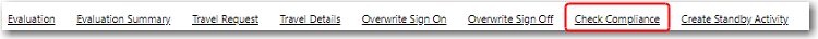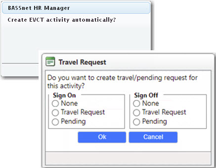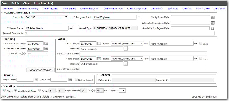 Note on the duration of the activity (as set in the Planned Start Date and Planned End Date fields): A back-end database-controlled configuration is available to allow you to specify the maximum length (in number of days) that can be set for an activity when planning it before an informational message is displayed by the System. For instance, if you specify this configuration as ‘365’ days and then attempt to create a new Activity with a duration that equals to or exceeds 365 days, the System will display a message indicating the length of the activity you are planning. You can choose to proceed or stop. This is to ensure that a realistic date is entered for the activity. Please note that this feature is a back-end database-controlled configurable feature. If you would like to explore the option of including this feature, please contact BASS Support. Note on change to Reliever: If a crew member who has been assigned as a ‘Reliever’ for another crew member is removed from the Reliever relationship because there is a change to the Vessel name for the Reliever’s relevant Activity (under the Activity Information section), a message will be displayed giving you the option to notify other users that the crew member has been removed as a Reliever. If you elect to send the notification, an email window will be displayed for you to send details of the Reliever’s removal to other Users. 5. Click Save after you have completed your entries. A pop-up message will be displayed asking you if you want to create an EVCT activity automatically, where you can either choose Yes or No. Then, a Travel Request pop-up window will be displayed asking you if you want to create travel requests/pending travel requests for the activity. Select the relevant radio buttons to make the travel requests or click None, then click OK.   Note on Wage Validity: A back-end System configuration is available where, if the configuration is turned on, the System will check for any expired or invalid wages in an Activity or an Account Period and prompt you if any were found. The configuration can be set to either allow you to continue after the prompt or stop you from proceeding until the expired/invalid wages have been resolved. Please note that this feature is a back-end database-controlled configurable feature. If you would like to explore the option of including this feature, please contact BASS Support. Note: If your System Administrator has turned on the Check Compliance auto-prompt feature, then when you Save the Activity, the Check Compliance pop-up window will display the validity of the selected crew member's licenses or training certificates. This pop-up window will only be displayed upon saving the activity. The Check Compliance screen can also be accessed by selecting an Activity record and selecting the Check Compliance link. On the Check Compliance screen, the System will also display the number of cabins that are available/occupied in a vessel. This information is taken from the vessel’s Vessel Particulars – Owner tab – Manning sub tab – Accom. Available field.