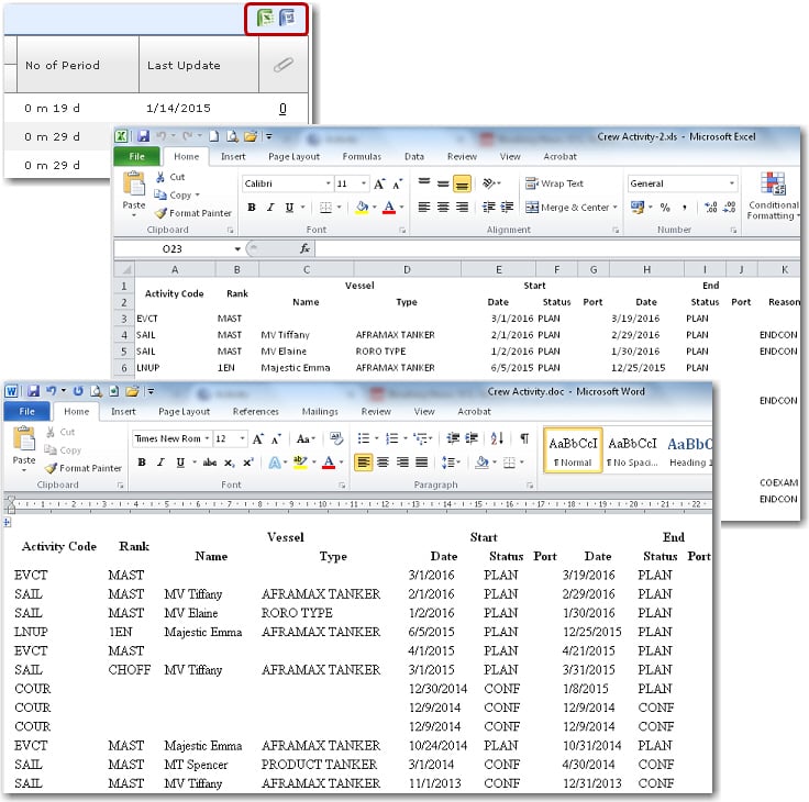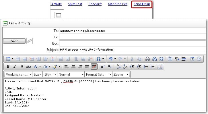 Note: You can select an Activity record and click the Manning Fee link to enter the details of the manning fees. You can further indicate if any amount is to be charged to a customer, as well as specify the currency rate of the entered amount and view the amount in your System's base currency. The System will calculate the rate of exchange automatically.   Note: You can select an Activity record on the Activity screen and click the Send Email link to email the details of the activity to the crew member's Manning Agent.   Note: On the Activity screen, you can click in the Attachment column to upload any attachments, if needed. The Upload Manager will be displayed. Click the Add Attachment(s) button to browse and select the attachment that is to be uploaded. Click OK. The attachment will be uploaded and can be accessed the next time from the Upload Manager. To launch the Upload Manager again, simply click in the Attachment column.   Note: On the Activity screen, you can print out reports for each crew member for each activity. Select an Activity record and then click Print. A Report pop-up window will be displayed where you can then click the report that you want to generate. If you do not select an activity record first before clicking Print, the System will not generate your selected report.   Note: On the Activity screen, you can click the icons at the top-right of the table to Export to Excel and/or Export to Word ALL of the crew member's activity records to a Microsoft Excel and/or Microsoft Word file.