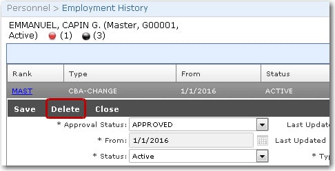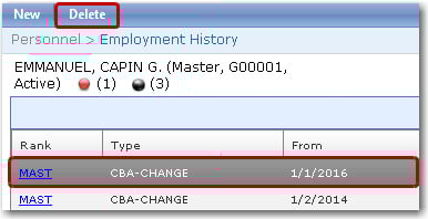| To delete a crew member's employment history record: 1. From the HR Manager main menu, click Profiles under the Personnel menu.. 2. Ensure that the crew profile for which you want to delete employment history details has been loaded. Use the Personnel search field to search and select the relevant crew profile. Note: To use a previously saved list of crew, click the search icon in the Personnel search field to use the Personnel List feature on the Simple Search window. Use the drop-down function to select and load a list from the Personnel List section and click a crew member from the Search Result section to view his profile.   3. After you have loaded the crew profile record, click the Employment tab. 4. Click an employment record that you want to delete under the Employment History, Company Awards, Crew Benefits or Bond sub tab. 5. The selected crew member's employment details will then be displayed. Click Delete. Click Yes to confirm your intention to delete the selected record and it will then be removed from the table.   Note: Alternatively, on the Employment History screen, highlight the employment history record that you want to delete. Click the Delete button at the top-left of the screen.