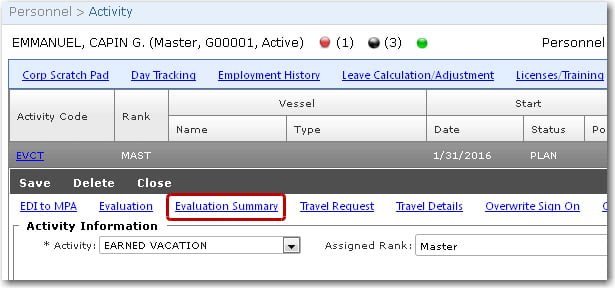 Screen Navigation: Personnel - Profiles - Activity tab - Evaluation Summary link