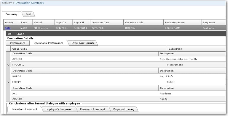 | To view an evaluation summary of a crew member: 1. From the HR Manager main menu, click Profiles under the Personnel menu. 2. Ensure that the crew profile of which you want to view an evaluation summary has been loaded. Use the Personnel search field to search and select the relevant crew profile. Note: To use a previously saved list of crew, click the search icon in the Personnel search field to use the Personnel List feature on the Simple Search window. Use the drop-down function to select and load a list from the Personnel List section and click a crew member from the Search Result section to view his profile.   3. After you have loaded the crew profile record, click the Activity tab. 4. Select an activity of which you want to view the evaluation summary. The Activity screen will be displayed where you can then click the Evaluation Summary link.   5. The Evaluation Summary screen will be displayed. The evaluations that have been carried out on this crew member are listed under the Summary tab while the goals that have been set are listed under the Goal tab.   6. Click an evaluation record to view the details of the selected evaluation. You can expand each section and view the scores given for each element. However, you will not be able to change any of the scores that have been entered.   7. The tabs at the bottom of the page allow you to see all comments from the Evaluator, Employee and Reviewer respectively during the evaluation. If training has been proposed for the crew member, it will be listed under the Proposed Training tab.