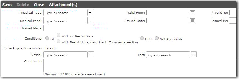 5. The Medical Type Details table will be populated based on your selection in the Medical Type field above. You can click on a record in the table to enter values and comments as well.   6. The Cost Details table enables you to enter cost details with regards to this medical examination. Click the '+' icon to add information in the table and the Medical Examination - Assign Cost window will be displayed. You can select the Cost Code followed by the Date of the medical examination and the Amount of the examination.   7. Click Save after you have completed your entries to save the information entered. The medical record will now be listed in the Medical Examination table. 8. You can also click an entry in the Attachments column of the table to upload soft copies of the medical reports into the System. The Upload Manager will be displayed. Click the Add Attachment(s) button to browse for and select the attachment that is to be uploaded. Click OK. The attachment will be uploaded and can be accessed the next time from the Upload Manager window. To launch the Upload Manager again, simply click in the Attachment field. Note: A back-end database-controlled feature is available where the System will perform a check on whether or not there are restrictions to a crew member's fitness in a Medical Examination record. If a crew member's fitness if 'Without Restrictions' (as selected in the Conditions field), then the System will perform the necessary checks on the validity of the record on the Check License screen. However, if 'With Restrictions, describe in Comments section' is selected, then the System will automatically highlight the record in purple (as 'Expired') on the Check License screen. Please note that this is a back-end database-controlled feature. If you would like to explore the option of including this feature, please contact BASS Support.