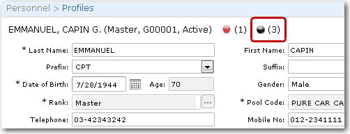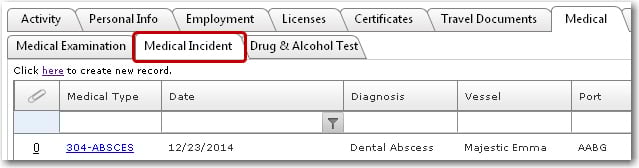 | To add a new medical incident details for a crew member: 1. From the HR Manager main menu, click Profiles under the Personnel menu. 2. Ensure that the crew profile for which you want to create a new medical incident record has been loaded. Use the Personnel search field to search and select the relevant crew profile. Note: To use a previously saved list of crew, click the search icon in the Personnel search field to use the Personnel List feature on the Simple Search window. Use the drop-down function to select and load a list from the Personnel List section and click a crew member from the Search Result section to view his profile.   3. After you have loaded the crew profile record, click the Medical Incident sub tab under the Medical tab. This sub tab is used to log the details of the crew member's visit to the doctor due to an illness or an injury.   4. Click the 'Click here to create new record' link to create a new medical incident record and the Medical and P&I screen will then be displayed. Select the Status of this incident record and then, under the Injury/Illness Details tab, enter information in the following fields: