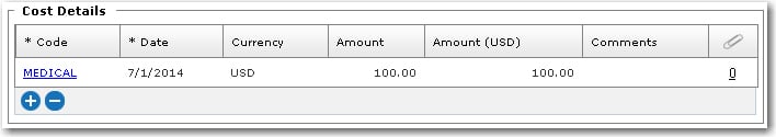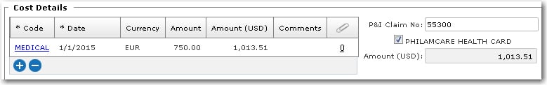 8. In the Treatment Details section, the table is populated based on your selection of injury Type under the Injury/Illness Details tab. You can then click a record in the table and enter the value and comments pertaining to the treatment.   9. In the Cost Details section, the table enables you to enter cost details with regard to medical treatment. Click the '+' icon to add a cost details record and enter the information in the available fields on the Onboard Treatment - Assign Cost window. Select the Cost Code followed by the Date of the medical visit and the Amount of the treatment. Click OK once done.   10. If the crew member received treatment ashore, enter information under the Ashore Treatment sub tab:
