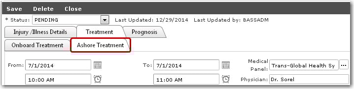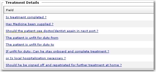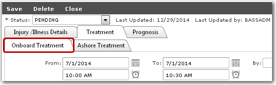 6. In the Illness Details section, you can further enter information pertaining to the crew member's injury in the Symptoms, Diagnosis and Comments fields. Click Save to save your entries.   7. Then, click the Treatment tab to enter information about the treatment received by the crew member. If the crew member received treatment onboard, enter information under the Onboard Treatment sub tab: