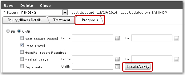11. In the Treatment Details section, the table is populated based on your selection of injury Type under the Injury/Illness Details tab. You can then click a record in the table and enter the value and comments pertaining to the treatment.   12. In the Cost Details section, the table enables you to enter cost details with regard to medical treatment. Click the '+' icon to add a cost details record and enter the information in the available fields on the Ashore Treatment - Assign Cost window. Select the Cost Code followed by the Date of the medical visit and the Amount of the treatment. Click OK once done.   13. Click Save to save your entries. Then, click the Prognosis tab and select whether the crew member is Fit or Unfit for duty. If the crew member is deemed unfit, you can further select whether the crew member should be rested, hospitalized or repatriated, etc. Note: If the record is linked to an activity, you can click the Update Activity button to update the crew member's activity on the Activity screen based on the prognosis.   14. Click Save after you have completed your entries to save the information entered. The medical record will now be listed in the Medical Incident table. An indicator will then be displayed on the Profiles screen to alert you that the crew member has had a medical incident. This alert will be displayed as a black dot with the number of medical incidents recorded for the crew member. Clicking this indicator will open up the Medical Incident tab on the Medical and P&I screen for this crew member.   15. You can also click an entry in the Attachments column of the table to upload soft copies of the medical reports into the System. The Upload Manager will be displayed. Click the Add Attachment(s) button to browse for and select the attachment that is to be uploaded. Click OK. The attachment will be uploaded and can be accessed the next time from the Upload Manager window. To launch the Upload Manager again, simply click in the Attachment field.