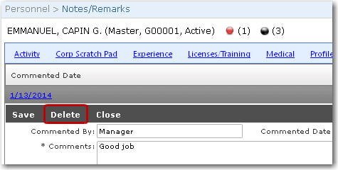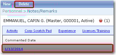 | To delete a previously created note/remark: 1. From the HR Manager main menu, click Profiles under the Personnel menu. 2. Ensure that the crew profile for which you want to delete a note or remark has been loaded. Use the Personnel search field to search and select the relevant crew profile. Note: To use a previously saved list of crew, click the search icon in the Personnel search field to use the Personnel List feature on the Simple Search window. Use the drop-down function to select and load a list from the Personnel List section and click a crew member from the Search Result section to view his profile.   3. After you have loaded the crew profile record, click the Notes/Remarks link. 4. On the Notes/Remarks screen, click the relevant record that you want to delete. 5. The selected crew member's crew note or remark details will then be displayed. Click Delete. Click Yes to confirm your intention to delete the selected record.   Note: Alternatively, on the Notes/Remarks screen, highlight the record that you want to delete. Click the Delete button at the top-left of the screen.