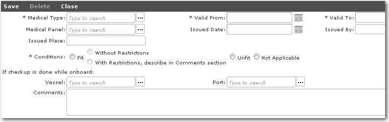 | To add a new medical examination details for an onboard crew member: 1. From the HR Manager main menu, click Medical and P&I under the Personnel menu. 2. On the Medical and P&I screen, use the Personnel search field to search and select the relevant onboard crew member. Note: To use a previously saved list of crew, click the search icon in the Personnel search field to use the Personnel List feature on the Simple Search window. Use the drop-down function to select and load a list from the Personnel List section and click a crew member from the Search Result section to view his record.   3. After you have loaded the crew record, click the Medical Examination tab. This tab is used when an onboard crew member is undergoing a medical examination for the purposes of reporting for duty.   4. Click New to create a new medical examination record and enter information in the following fields: