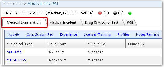 Screen Navigation: Personnel - Medical and P&I - Medical Examination tab
