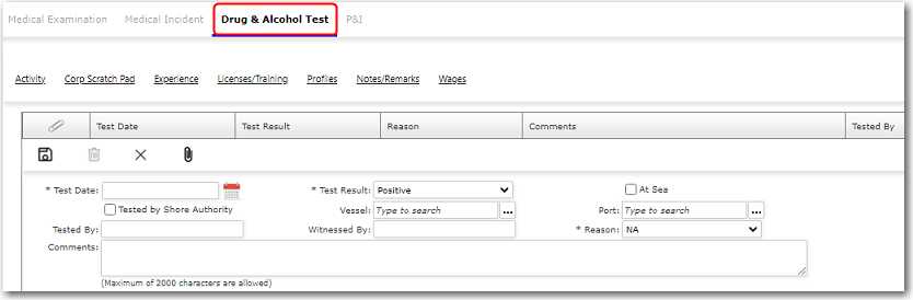 This feature enables you to enter drug and alcohol test records for individual crew members. Note that, under the Fleet module, this information can be entered based on Vessel selection and is only available for the crew sailing on that vessel. On the Medical and P&I screen, however, you can enter this same information for a crew member for drug & alcohol tests that are carried out at any time. Under the Drug & Alcohol Test tab, you can enter the test date, result, where it was administered, the name of the person who carried out the test and so on.