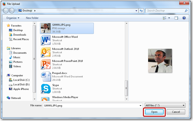 | To attach a profile photo to a crew profile: 1. On the Profiles screen, ensure that the crew profile to which you want to attach a profile photo has been loaded. Use the Personnel search field to search and select the relevant crew profile. 2. Mouse-over the profile photo placeholder and an Upload link will be displayed. Click the Upload link.   3. The Upload Profile Picture pop-window is displayed. Click the Select button.   4. The File Upload window is displayed. Here, browse through your directories and select the profile photo file that you wish to upload and then, click Open.    5. The file path will then be displayed in the Upload Profile Picture window. Click Upload.   Note: Click Remove to remove the selected profile picture. 6. The profile photo will be uploaded and displayed in the profile photo placeholder.   7. Click Save at the top of the page to save the changes you have made to this record. The profile photo you have attached will not be saved if you do not click the Save button. Note: If you want to change or delete the uploaded profile photo, mouse-over the photo placeholder and click Clear. This removes the current photo. You can then follow the instructions listed above to upload a new photo.