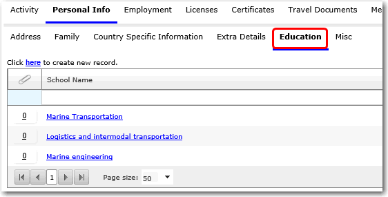 2. After you have loaded the crew profile record, click the Education sub tab under the Personal Info tab.
