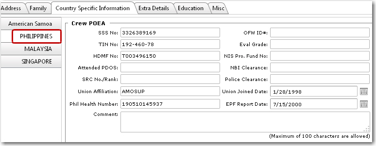 2. After you have loaded the crew profile record, click the Country Specific Information sub tab under the Personal Info tab.