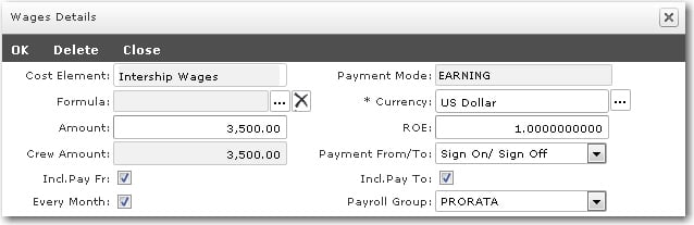 This feature allows you to enter contractual wage details of a crew member. In the Cost Element section, the breakdown of the payroll is further defined into basic pay, fixed overtime, allowance and so on.