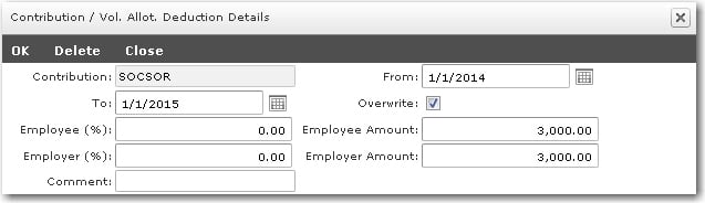 6. Click OK once done and move on to the Contribution/Vol. Allot. Deduction tab. 7. Under the Contribution/Vol. Allot. Deduction tab, a list of contributions and voluntary allotments that is to be made by this crew member is displayed. This information is retrieved from the Contribution/Allotment Deduction Register. To overwrite the current contribution/allotment amount, click the Contribution record to open the Contribution/Vol. Allot. Deduction Details window. Then, select the Overwrite check box and enter the Employee and Employer contribution amount manually. Use the Comment field to enter comments relating to the contribution. The From and To fields allow you to select validity periods to indicate multiple contributions/allotments at different periods.   Note: A back-end configuration is available to disable the Overwrite check box (by entering the contribution code in the secondary value of the config). 8. Click OK once done and move on to the Comments tab. The Comments tab allows you to enter any comments pertaining to this wage record. 9. Click Save to save all your entries.