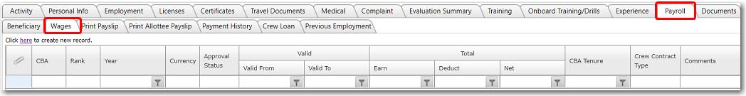 | To enter details of a member's wage: 1. From the HR Manager main menu, click Profiles under the Personnel menu. 2. Ensure that the crew profile of which you want to create wage details has been loaded. Use the Personnel search field to search and select the relevant crew profile. Note: To use a previously saved list of crew, click the search icon in the Personnel search field to use the Personnel List feature on the Simple Search window. Use the drop-down function to select and load a list from the Personnel List section and click a crew member from the Search Result section to view his profile.   3. After you have loaded the crew profile record, click the Wages sub tab under the Payroll tab.   4. Click the 'Click here to create new record' link to create a new wages record. You have three options here: a. Use an existing CBA Scheme - In the CBA field, use the Lookup function to select the CBA scheme this crew member is tied to. The rest of the fields in this row will be automatically populated based on the CBA selected. If you have selected to use a CBA scheme, you will not be able to edit the records that are displayed under the Wages Details tab as they are displayed based on the CBA scheme selected.   Note: If the current CBA attached to a crew member is listed as 'Expired', you would then need to select and add a valid CBA instead. b. Create new details - Specify the details in the individual fields as needed. Create all Cost Element details under the Wages Details tab.   c. Copy from a CBA Scheme - In the CBA field, click the Lookup function. In the CBA Lookup window, a list of available CBA codes will be displayed. Select a particular CBA code whose details you want to copy. Then, select the Copy Content Only check box. Click Select to save your selection and close the Lookup window. All the details from this CBA will be displayed in the table. Make your changes as required under the Wages Details tab.   5. The Wages Details tab displays Cost Element information based on the CBA you have selected (if you have selected to use a CBA scheme). You can add more cost elements to this crew member's wage record by clicking the '+' icon at the bottom of the table. The Cost Elements window will be displayed. Make your selection and then click OK. The selected Cost Element will then be listed in this table. Click the Cost Element record to make changes to the fields as required: