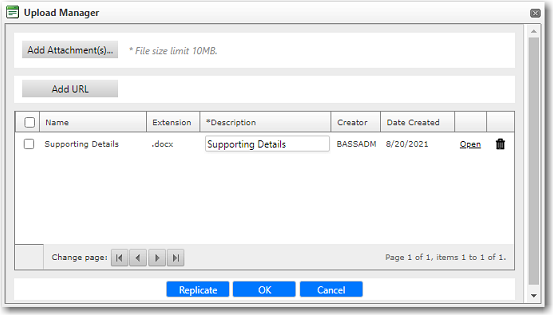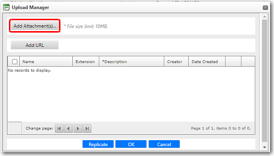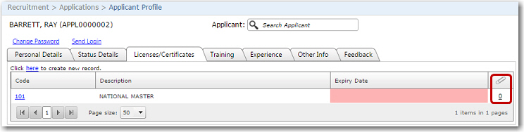 Note: To add more License/Certificate details, click the 'Click here to create a new record' link to add a new row and select the relevant license. 4. To add attachments to any of the licenses/certificates record, click the attachment link for the selected record. The Upload Manager pop-up window will appear. 5. Click the Add Attachment(s) button. 6. Browse through your directories and select the file that you wish to upload and then, click Open. (You can select and upload up to 5 different files at the same time.) The file will be uploaded and displayed in the Upload Manager's list of records. To view the file, click Open. To upload the file, click OK. Note: If you want to delete the file, select the file and click the Delete icon (‘trash’ icon). This removes the file from the list. You can also click the Add URL button to insert relevant or important links. Note: If the applicant had included attachments under the Licenses/Training tab when filling up the application form, you will be able to access those documents here. If the applicant is hired, these attachments will then also be accessible on the applicant’s new Profile screen under the Licenses/ Certificates tab. 7. Click the Training tab and edit information in the following fields: Note: The list of courses and training entered in the Training tab must be relevant to the job applied for.