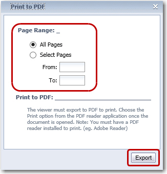 To print a report: 1. After you have generated a report, click the print icon. 2. The Print to PDF pop-up window will be displayed. In the Print Range section, click 'All Pages' if you would like to print all the pages in the report OR click 'Select Pages' and then specify the range of pages that you would like to print in the From and To fields. 3. Click Export. The report will be displayed in an Adobe PDF file. Please use the Print icon located within the PDF file to print your report. You are advised not to use the Print feature available on the browser as your report will not be correctly displayed.
