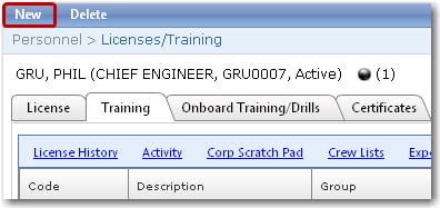 Note: To create a new training claim record for the crew member, click New on the Licenses/Training screen to enable new data entry. Please refer to the table above for field-by-field guidance.