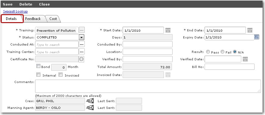 4. The selected crew member's Licenses/Training screen will then be displayed. Under the Details tab, you can view and edit the following training information: